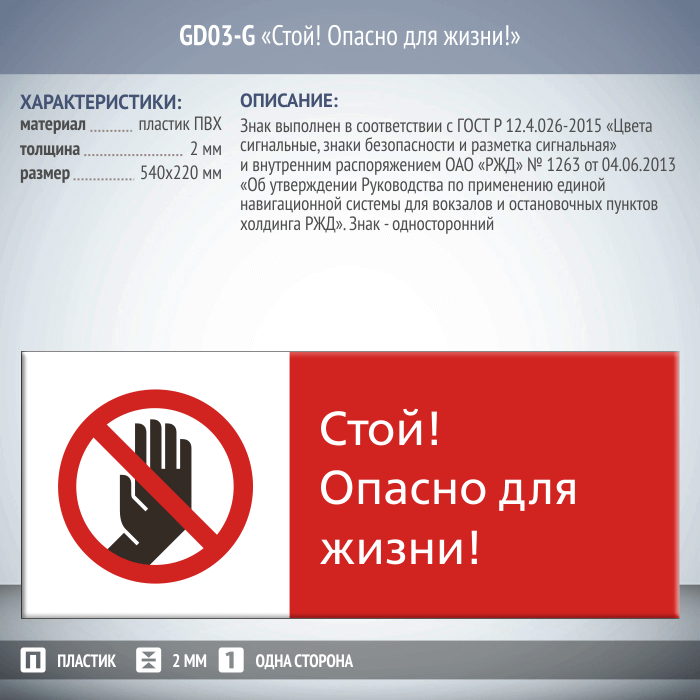 Знак «Стой! Опасно для жизни!», GD03-G (односторонний горизонтальный, 540х220 мм, пластик 2 мм)