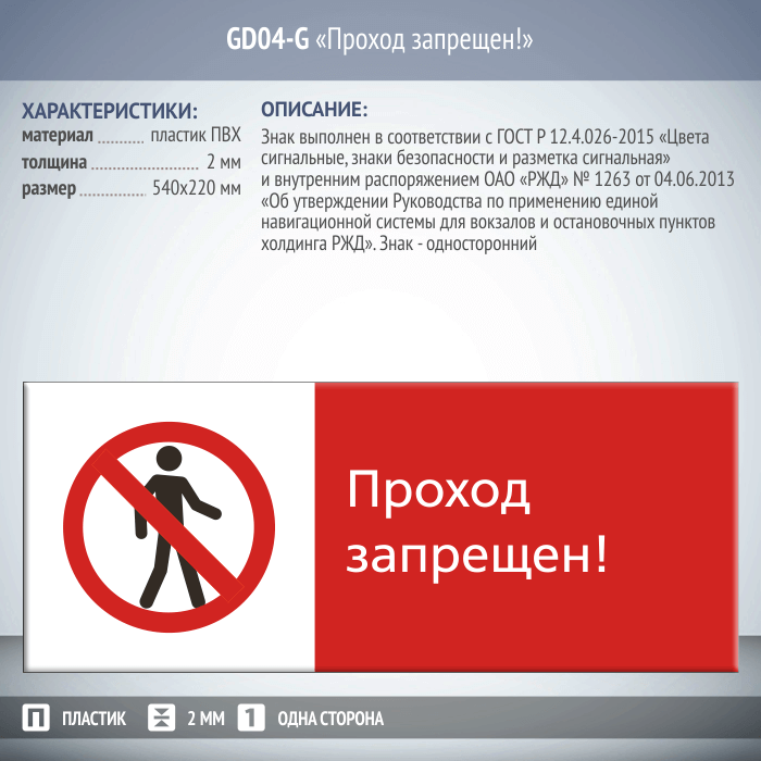 Знак «Проход запрещен!», GD04-G (односторонний горизонтальный, 540х220 мм, пластик 2 мм)