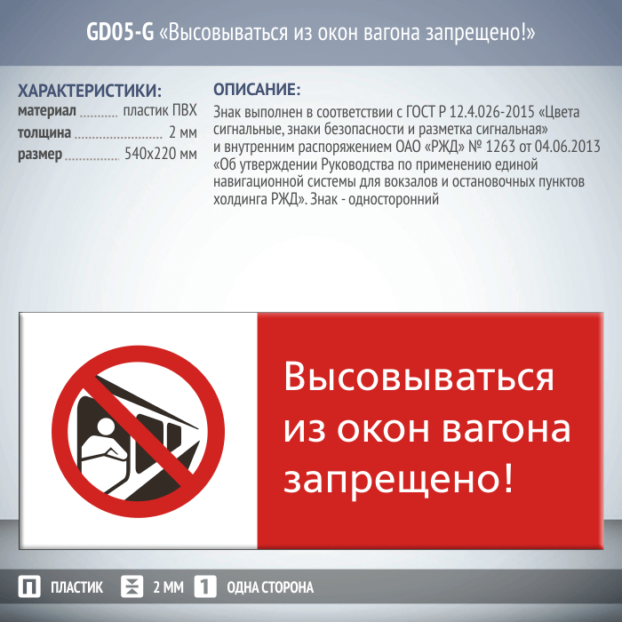 Знак «Высовываться из окон вагона запрещено!», GD05-G (односторонний горизонтальный, 540х220 мм, пластик 2 мм)
