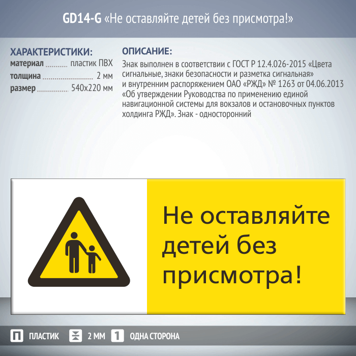 Знак «Не оставляйте детей без присмотра!», GD14-G (односторонний горизонтальный, 540х220 мм, пластик 2 мм)