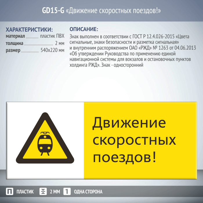 Односторонний знак безопасности «Движение скоростных поездов!» изготовлен на пластике, толщиной 2 мм и размером 450х700мм в соответствии с: