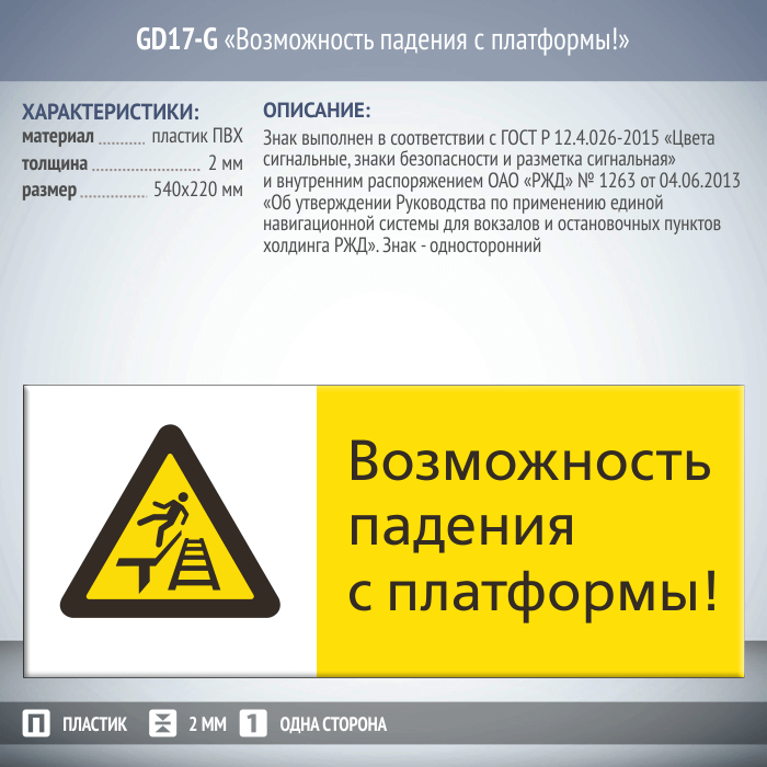 Односторонний знак безопасности «Возможность падения с платформы!» изготовлен на пластике, толщиной 2 мм и размером 450х700мм в соответствии с: