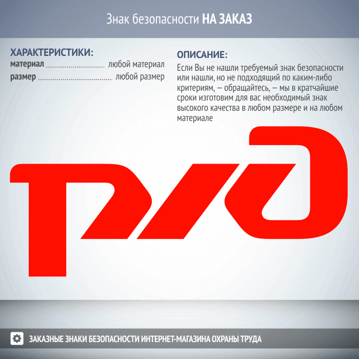 Если Вы не нашли нужный Вам знак безопасности для ОАО «РЖД» или нашли, но неподходящий по каким-либо критериям, – обращайтесь, – мы в кратчайшие сроки изготовим для вас необходимый знак высокого качества в любом размере (от 1 см2 до 4 м2) и на любом материале