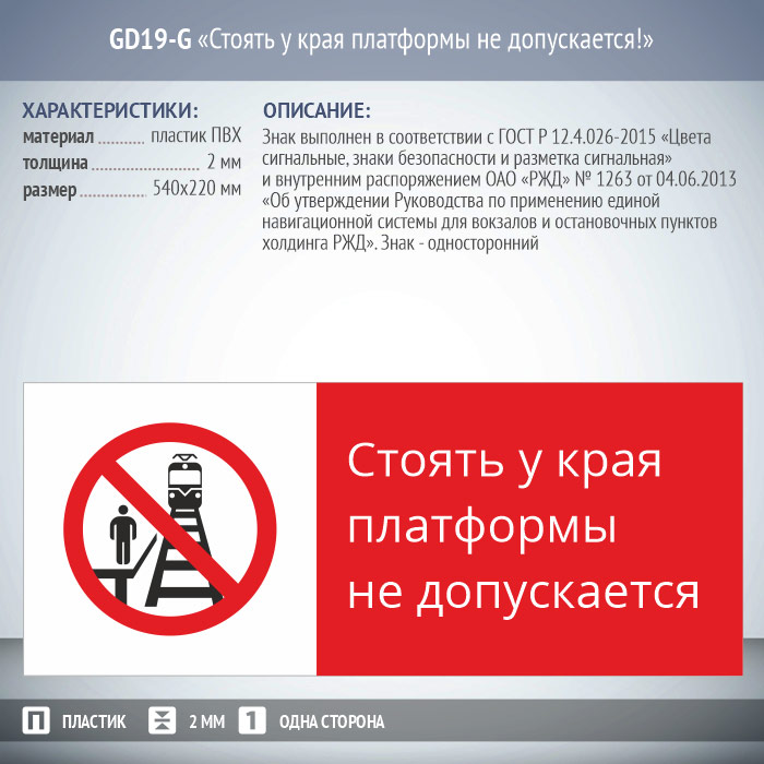 Односторонний знак безопасности «Стоять у края платформы не допускается!» изготовлен на пластике, толщиной 2 мм и размером 450х700мм в соответствии с: