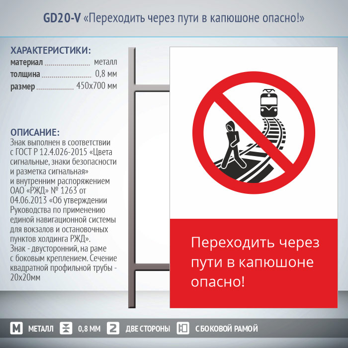 Знак «Переходить через пути в капюшоне опасно!», GD20-V (двусторонний вертикальный, 450х700 мм, металл, на раме с боковым креплением)