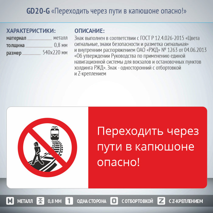 Знак «Переходить через пути в капюшоне опасно!», GD20-G (односторонний горизонтальный, 540х220 мм, металл, с отбортовкой и Z-креплением)