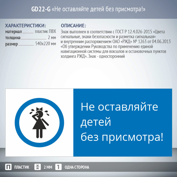 Знак «Не оставляйте детей без присмотра!», GD22-G (односторонний горизонтальный, 540х220 мм, пластик 2 мм)