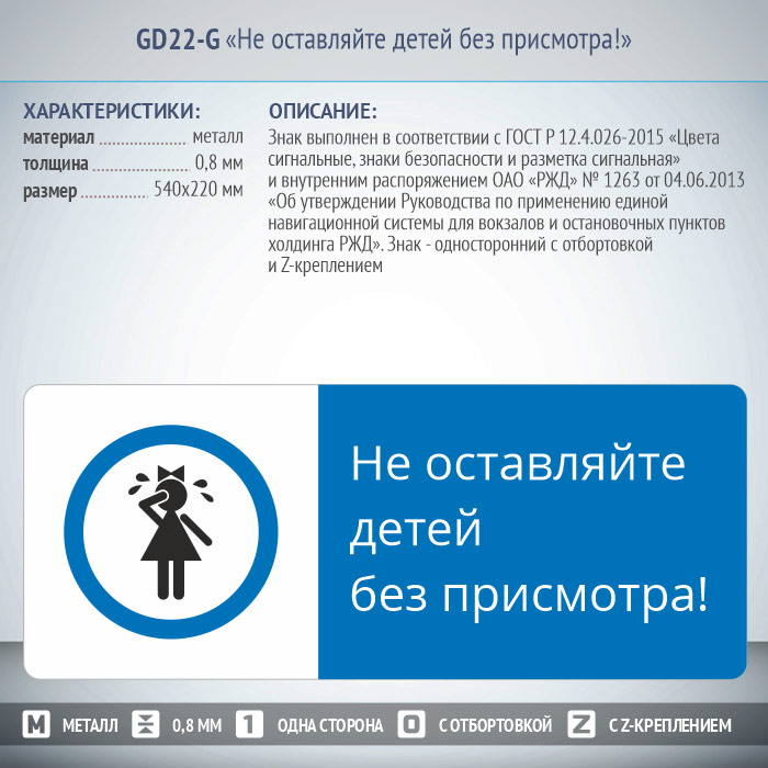 Знак «Не оставляйте детей без присмотра!», GD22-G (односторонний горизонтальный, 540х220 мм, металл, с отбортовкой и Z-креплением)