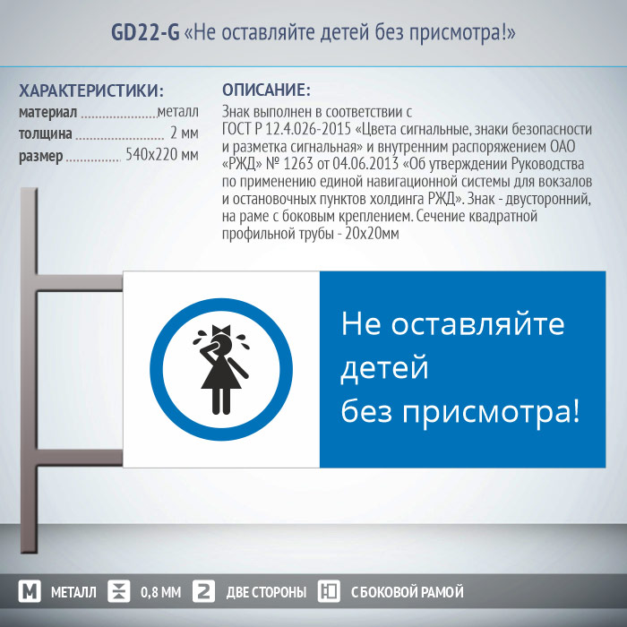 Знак «Не оставляйте детей без присмотра!», GD22-G (двусторонний горизонтальный, 540х220 мм, металл, на раме с боковым креплением)