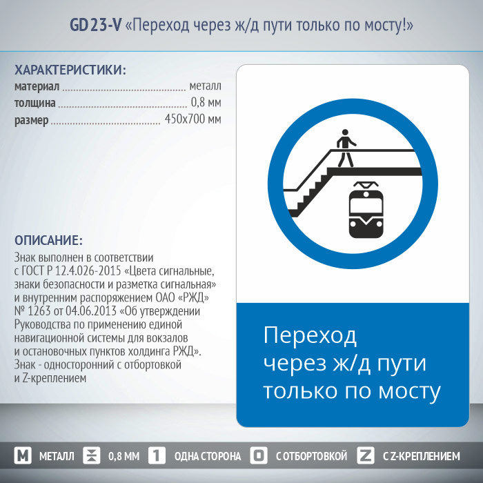 Односторонний знак безопасности «Переход через ж/д пути только по мосту!» изготовлен на металле, толщиной 0,8 мм и размером 450х700мм в соответствии с:
