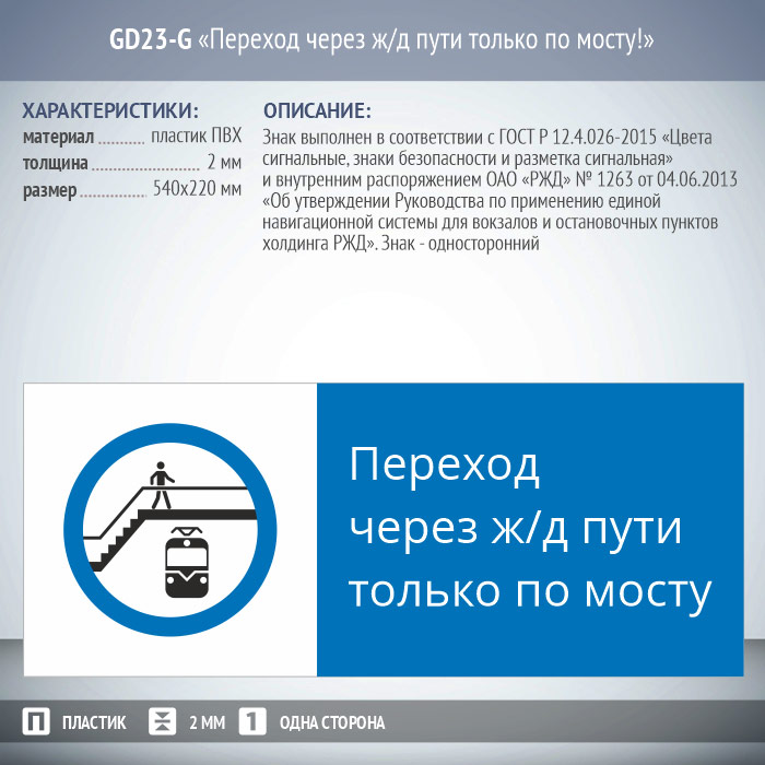 Знак «Переход через ж/д пути только по мосту!», GD23-G (односторонний горизонтальный, 540х220 мм, пластик 2 мм)