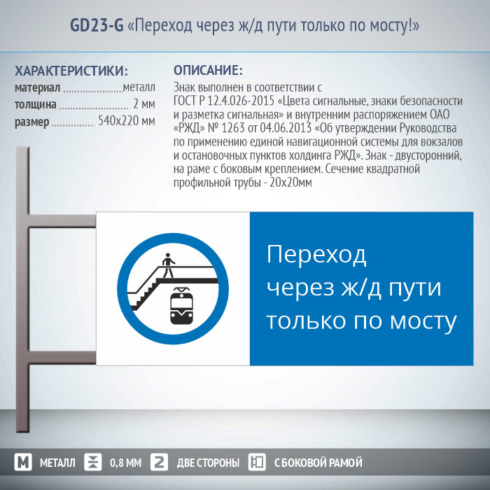 Знак «Переход через ж/д пути только по мосту!», GD23-G (двусторонний горизонтальный, 540х220 мм, металл, на раме с боковым креплением)