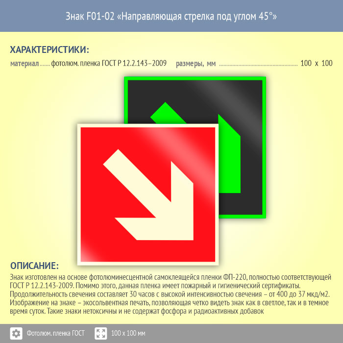 Знак F01-02 «Направляющая стрелка под углом 45°» на фотолюминесцентной пленке по ГОСТ 34428-2018, размером 100х100 мм указывает направление пути эвакуации вверх или вниз. Знаки пожарной безопасности изготовлены согласно ГОСТ Р 12.4.026-2015 и предназначены для обозначения мест нахождения средств противопожарной защиты и средств оповещения о возникновении пожара