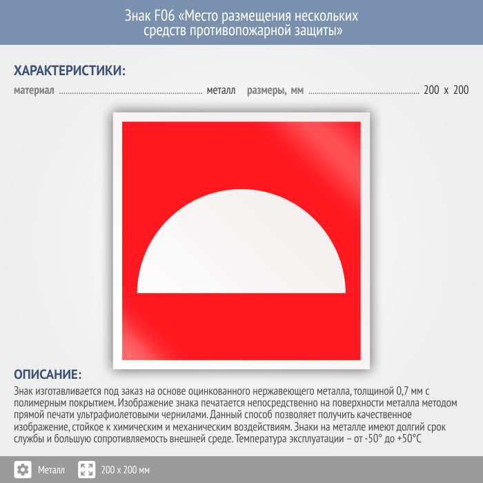 Знак F06 «Место размещения нескольких средств противопожарной защиты» на металле, размером 200х200 мм указывает место хранения одного или более средств пожарной безопасности. Знаки пожарной безопасности изготовлены согласно ГОСТ Р 12.4.026-2015 и предназначены для обозначения мест нахождения средств противопожарной защиты и средств оповещения о возникновении пожара