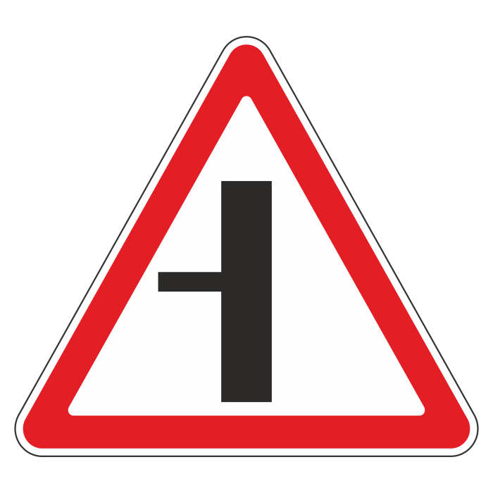 Предупреждает о близости примыкания второстепенной дороги слева. Дорожные знаки 2.3.1-2.3.7 устанавливают вне населенных пунктов перед всеми перекрестками на дорогах, обозначенных знаком 2.1. Знаки не устанавливают перед перекрестками со сложной планировкой и перед перекрестками, на которых главная дорога изменяет направление. Вне населенных пунктов знаки 2.3.1-2.3.7 устанавливают на расстоянии 150-300 м, в населенных пунктах - на расстоянии 50-100 м до перекрестка