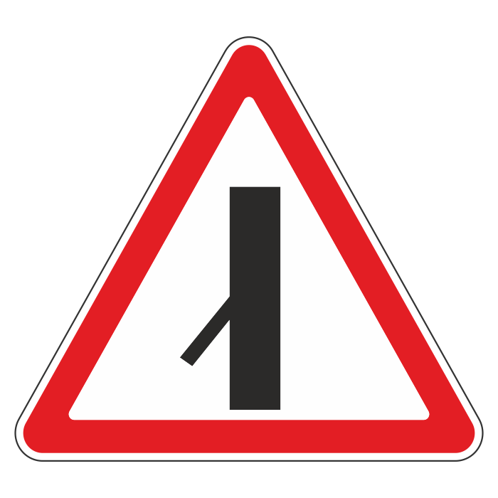 Дорожный знак 2.3.7 предупреждает о близости примыкания второстепенной дороги слева. Дорожные знаки 2.3.1-2.3.7 устанавливают вне населенных пунктов перед всеми перекрестками на дорогах, обозначенных знаком 2.1. Знаки не устанавливают перед перекрестками со сложной планировкой и перед перекрестками, на которых главная дорога изменяет направление. Вне населенных пунктов знаки 2.3.1-2.3.7 устанавливают на расстоянии 150-300 м, в населенных пунктах - на расстоянии 50-100 м до перекрестка