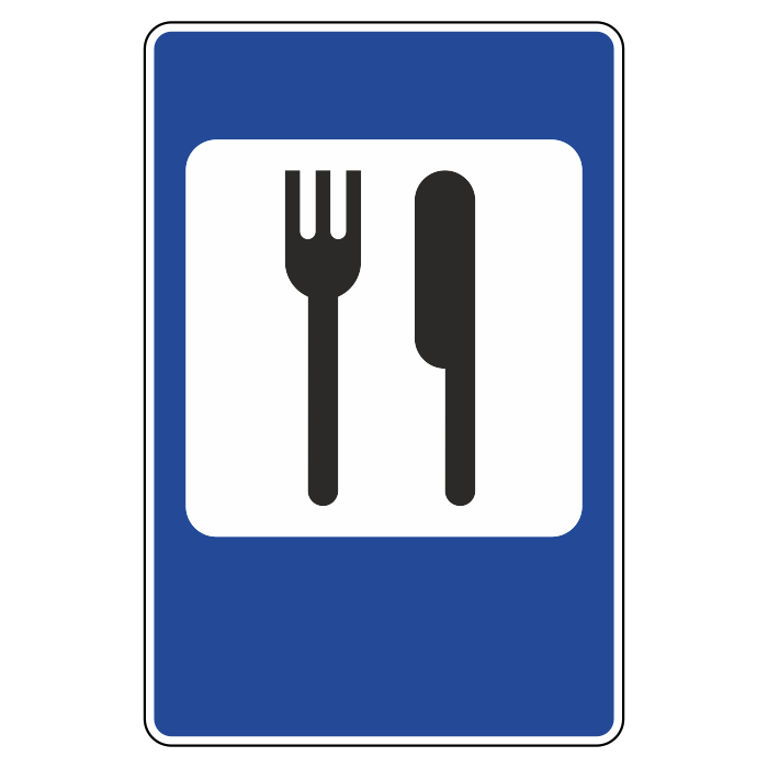 Знак указывает место, где находится Пункт питания. Дорожный знак 7.7 устанавливают у объекта