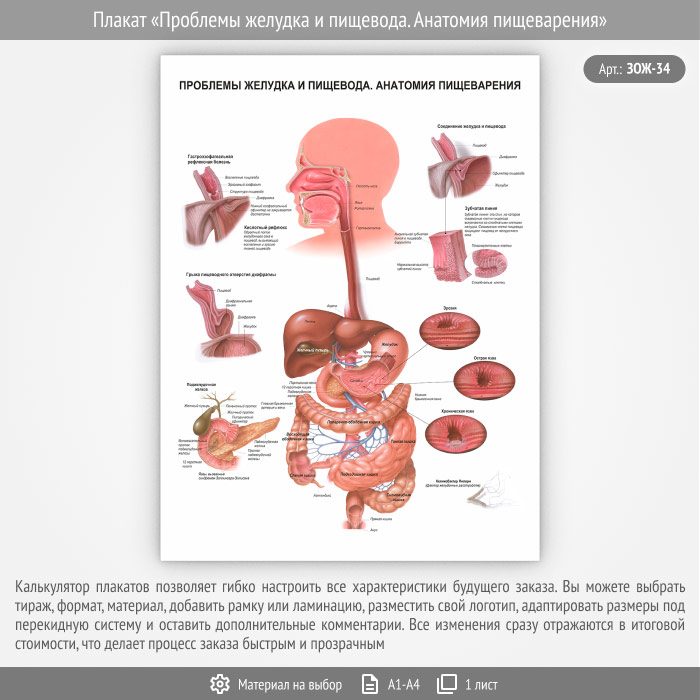 Плакат «Проблемы желудка и пищевода. Анатомия пищеварения» (ЗОЖ-34, 1 лист)
