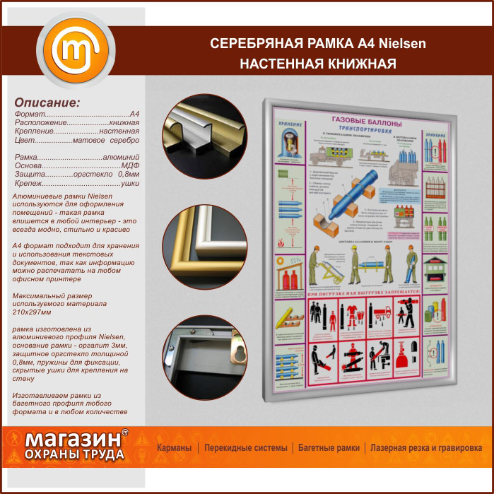 Настенная серебряная рамка А4 формата книжной ориентации из алюминиевого декоративного профиля «Nielsen» («Нельсон») используются для оформления помещений - такая рамка впишется в любой интерьер - это всегда модно, стильно и красиво. А4 формат подходит для хранения и использования текстовых документов, так как информацию можно распечатать на любом офисном принтере
