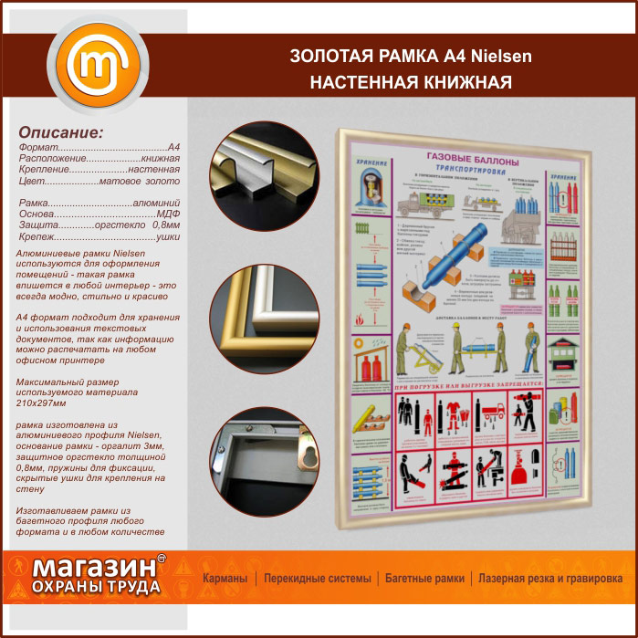 Настенная золотая рамка А4 формата книжной ориентации из алюминиевого декоративного профиля «Nielsen» («Нельсон») используются для оформления помещений - такая рамка впишется в любой интерьер - это всегда модно, стильно и красиво. А4 формат подходит для хранения и использования текстовых документов, так как информацию можно распечатать на любом офисном принтере
