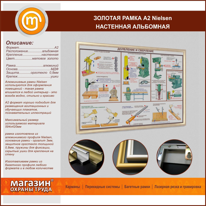 Настенная золотая рамка А2 формата альбомной ориентации из алюминиевого декоративного профиля «Nielsen» («Нельсон») используются для оформления помещений - такая рамка впишется в любой интерьер - это всегда модно, стильно и красиво. А2 формат хорошо подходит для размещения агитационных и обучающих плакатов, познавательных иллюстраций