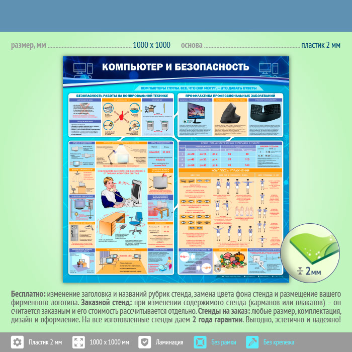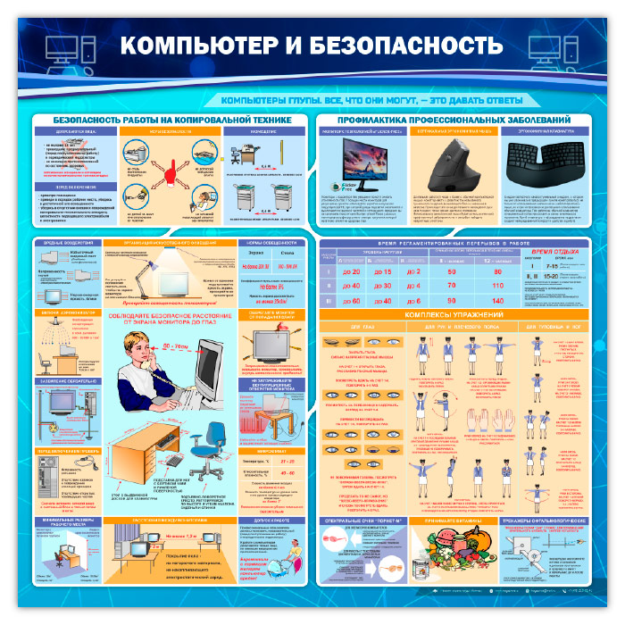 Стенд компьютер и безопасность – научит Вас, как правильно организовать рабочее место – освещение и аэроионизация воздуха, заземление и микроклимат, расположение компьютера в помещении. А также стенд всегда напомнит о вредном воздействии техники на человека, о том – как правильно делать упражнения и снимать усталость после работы за компьютером – комплекс упражнений для рук, глаз спины и время их выполнения…