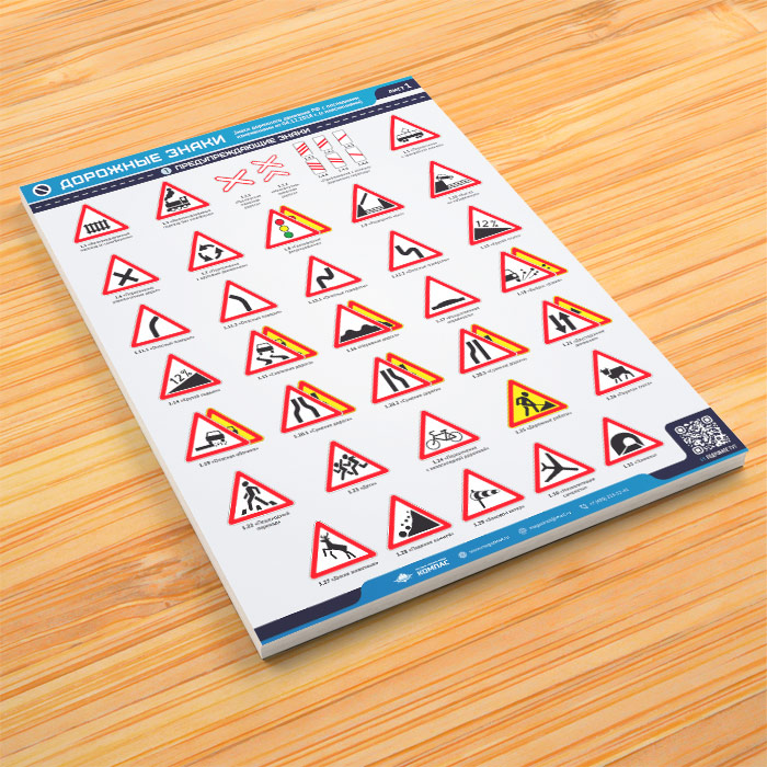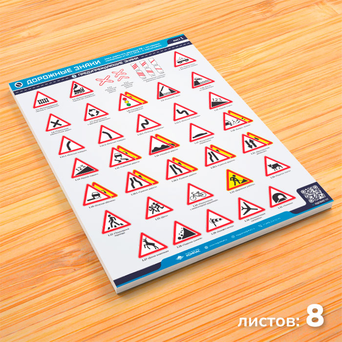 Комплект плакатов «Дорожные знаки» из 8 листов содержит информацию обо всех знаках дорожного движения Российской Федерации с пояснениями. Комплект разработан с учетом последних изменений от 04.12.2018