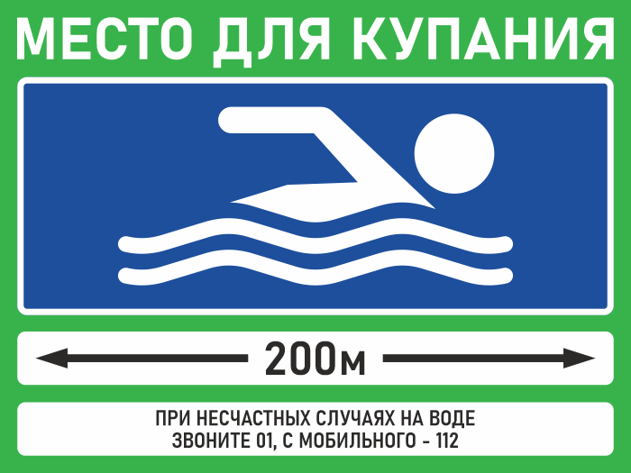 Знак «Место для купания», БВ-03 на 2-мм пластике, размером 400х300 мм разрешает купание в обозначенном знаком месте. Протяженность линии пляжа, разрешенной для купания указывается индивидуально. Так же знак содержит телефоны эксренных служб