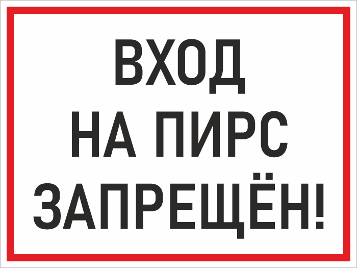 Знак «Вход на пирс запрещен!», БВ-05 на 4-мм пластике, размером 600х400 мм как уже очевидно из самого названия, запрещает входить на пирс