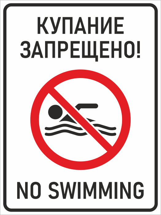 Знак «Купание запрещено! / No swimming», БВ-13 на металле, размером 300х400 мм как уже видно из названия, устанавливается для запрета на купание. Имеет дублирующуюся надпись на английском языке