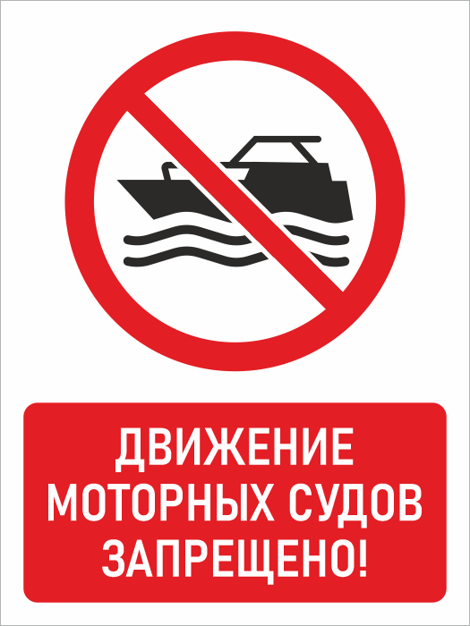 Знак «Движение моторных судов запрещено!», БВ-19 на 4-мм пластике, размером 300х400 мм как уже видно из названия, запрещает движение моторных судов