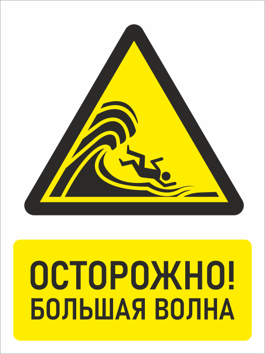 Знак «Осторожно! Большая волна», БВ-28 на 2-мм пластике, размером 300х400 мм как уже видно из названия, предостерегает об опасности в связи с большими волнами