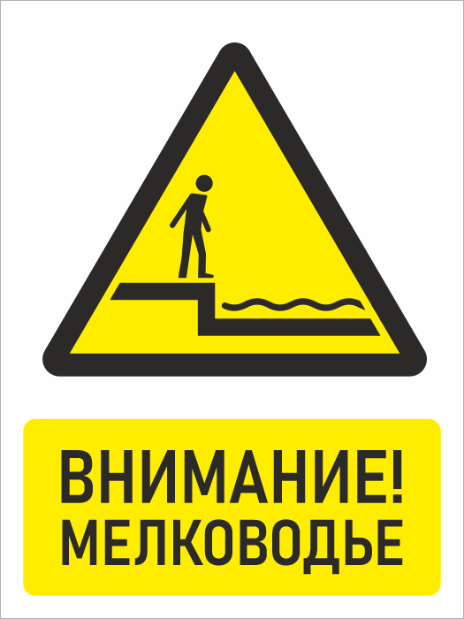 Знак «Внимание! Мелководье», БВ-29 на 4-мм пластике, размером 300х400 мм как уже видно из названия, предостерегает об опасности в основном ныряния в связи с малой глубиной