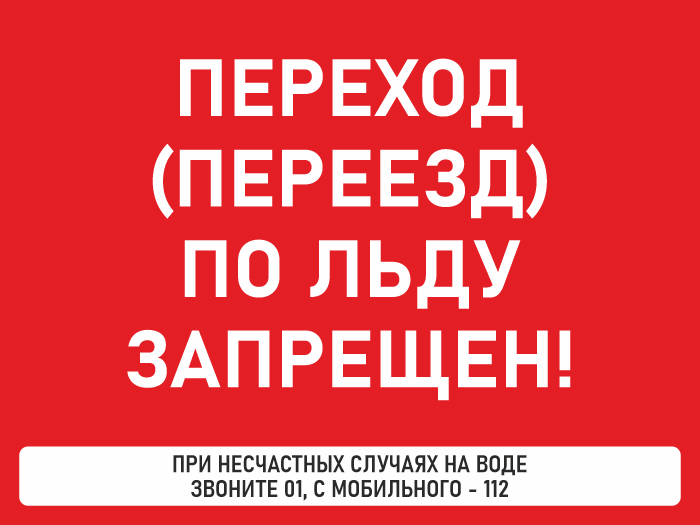 Знак «Переход (переезд) по льду запрещен!», БВ-37 на 2-мм пластике, размером 600х400 мм как уже видно из названия, обозначает место, в котором запрещен переход (переезд) по льду. Так же знак содержит телефоны эксренных служб