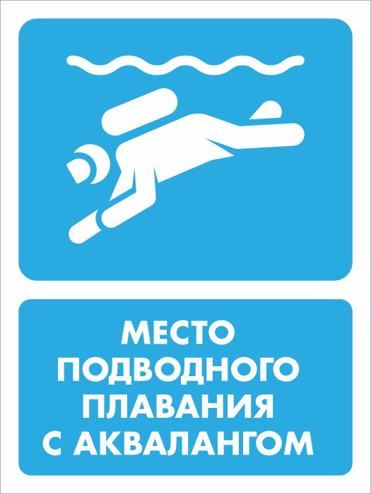 Знак «Место подводного плавания с аквалангом», БВ-42 на 4-мм пластике, размером 400х600 мм как видно из названия, обозначает место для подводного плавания с аквалангом