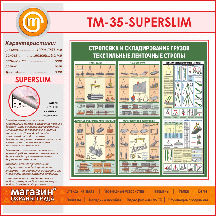 Стенд «Строповка и складирование грузов. Текстильные ленточные стропы» (TM-35-SUPERSLIM)