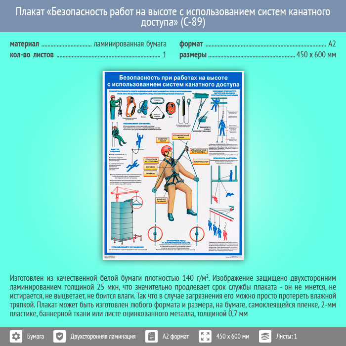 Плакат «Безопасность работ на высоте с использованием систем канатного доступа» (С-89, ламинированная бумага, А2, 1 лист)