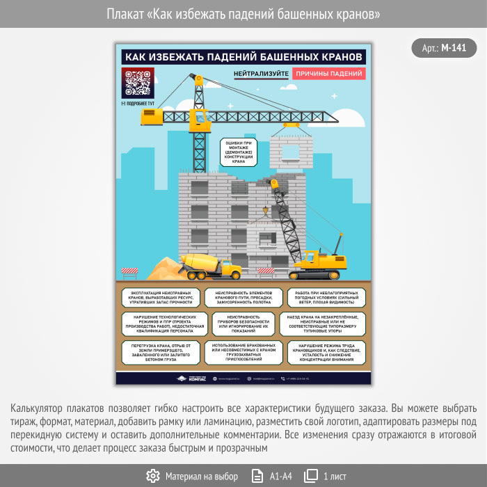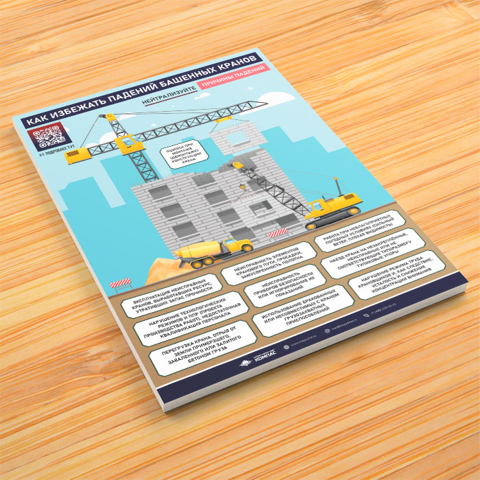 Плакат «Как избежать падений башенных кранов» с QR может быть изготовлен любого формата и размера, на бумаге, самоклеящейся пленке, пластике, баннерной ткани и металле. Разрабатываем, рисуем и изготавливаем плакаты на любую интересующую Вас тематику