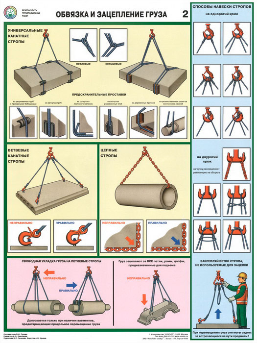 - Плакат «Обвязка и зацепление грузов» – универсальные канатные стропы, способы навески стропов, ветвевые канатные и цепные стропы