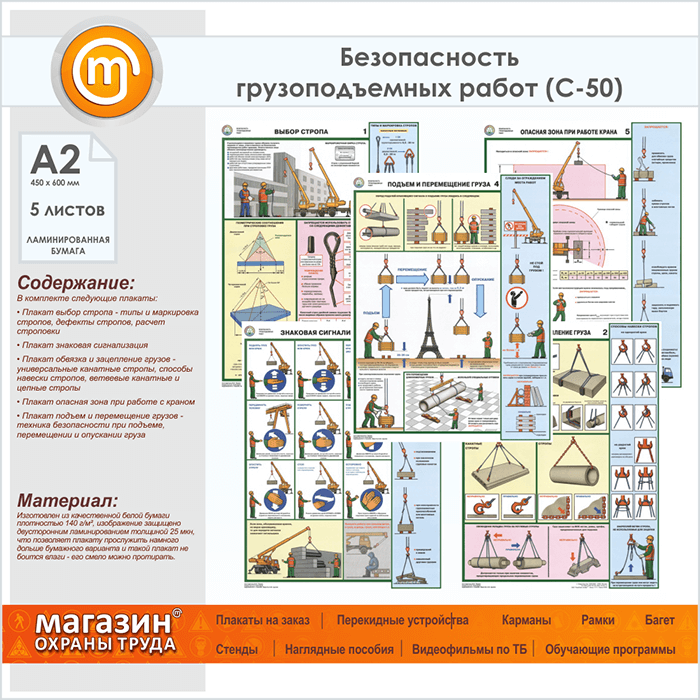 Плакаты «Безопасность грузоподъемных работ» (С-50, ламинированная бумага, А2, 5 листов)