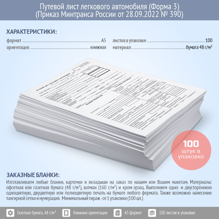 Путевой лист легкового автомобиля (Форма № 3) (Приказ Минтранса России от 28.09.2022 № 390) (упаковка из 100 штук)