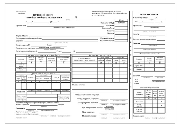 Путевой лист автобуса необходим для учёта работы автобуса на маршруте, как городского, так и пригородного. Унифицированная форма путевого листа автобуса – форма №6. Путевой лист автобуса – первичный документ, который получает каждый водитель, отправляясь в рейс. На основании бланка путевого листа автобуса производится расчет заработной платы для водителя