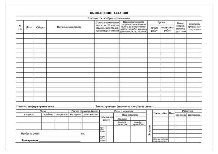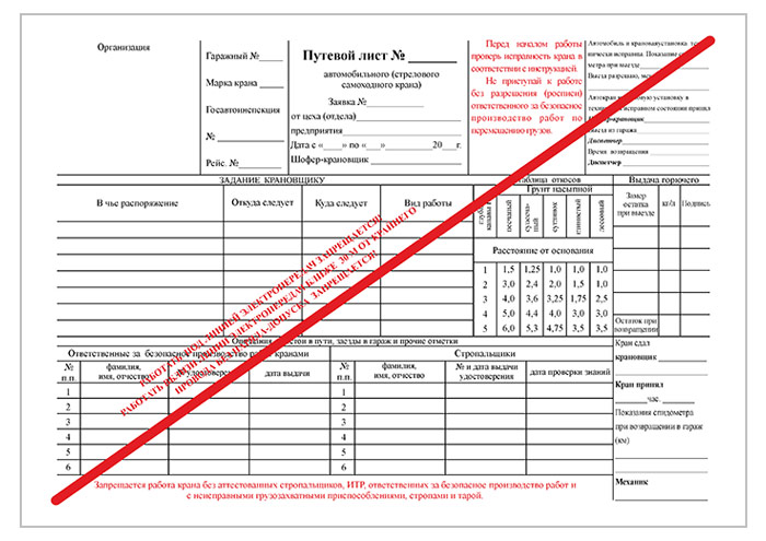 путевой лист автомобильного (стрелового самоходного) крана выдается водителю под расписку только на один рабочий день (смену) при условии, если путевой лист за предыдущий день работы уже сдан. Водитель не должен участвовать в заполнении путевого листа, за исключением строк о приеме и сдаче автомобиля механику