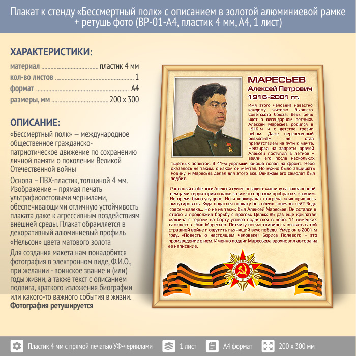 Плакат к стенду «Бессмертный полк» с описанием в золотой (матовой) алюминиевой рамке + ретушь фото (BP-02-A4, пластик 4 мм, А4, 1 лист)