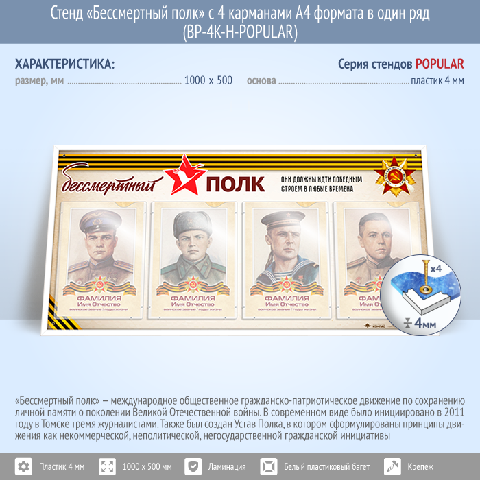 Стенд «Бессмертный полк» с 4 карманами А4 формата в один ряд (BP-4K-H-POPULAR)