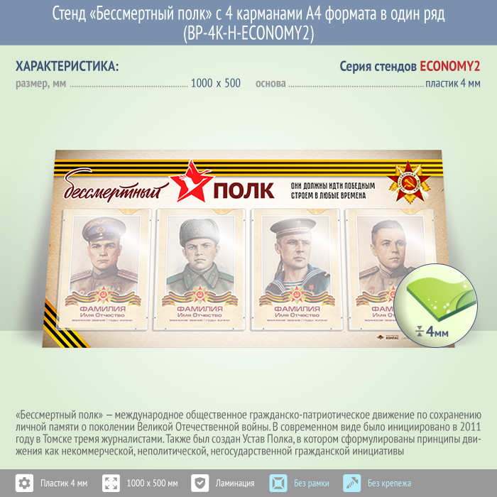 Стенд «Бессмертный полк» с 4 карманами А4 формата в один ряд (BP-4K-H-ECONOMY2)