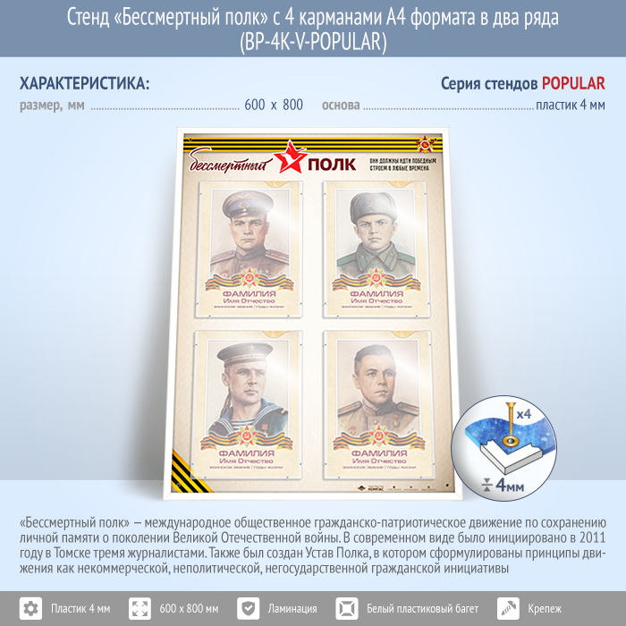 Стенд «Бессмертный полк» с 4 карманами А4 формата в два ряда (BP-4K-V-POPULAR)