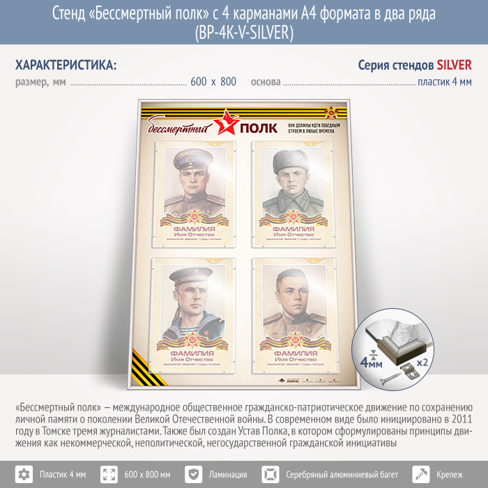 Стенд «Бессмертный полк» с 4 карманами А4 формата в два ряда (BP-4K-V-SILVER)