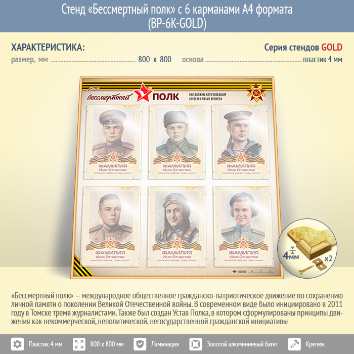 Стенд «Бессмертный полк» с 6 карманами А4 формата (BP-6K-GOLD)