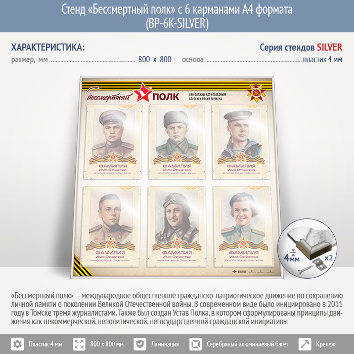 Стенд «Бессмертный полк» с 6 карманами А4 формата (BP-6K-SILVER)